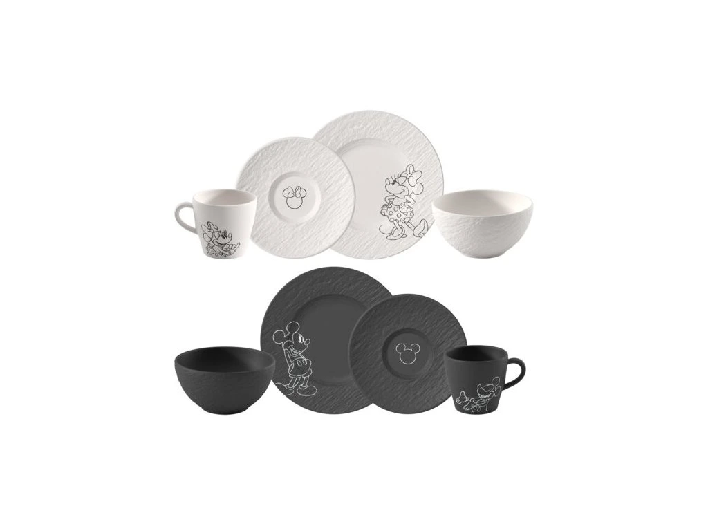 Kompletná súprava pre dve osoby s motívom Mickey a Minnie Mouse od Villeroy & Boch. Prémiový porcelán a moderný dizajn kolekcie Manufacture Rock. Ideálna voľba na štýlové raňajky aj ako darček.